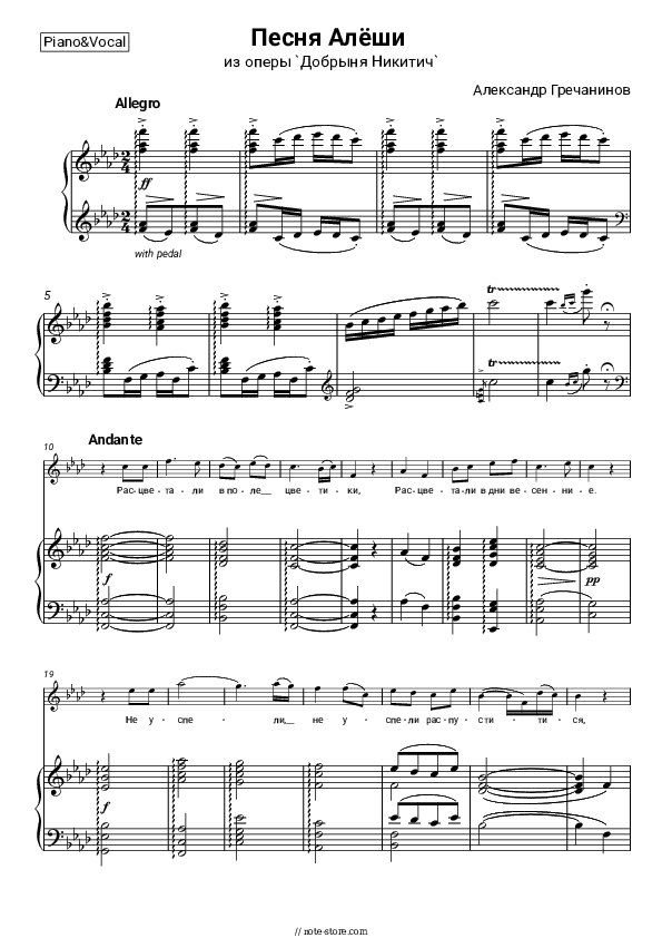 Description of the sheet music for Alexander Gretchaninov - Песня Алёши из оперы «Добрыня Никитич» arranged by Piano&Vocal