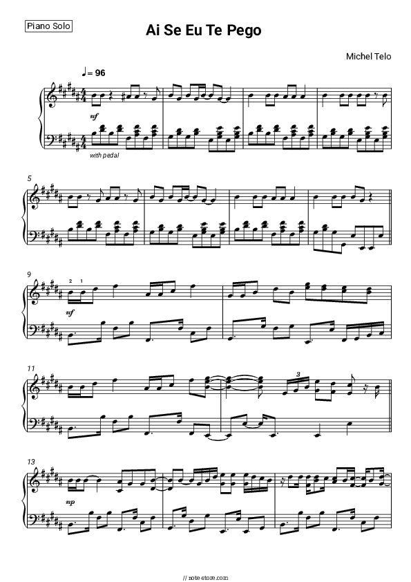 The piano sheet music for the melody Ai Se Eu Te Pego, performed by Michel Teló, is currently in Piano.Solo arrangement. This Dance music, Pop-genre track was created by expert musicians, ensuring the premium quality of musical notation.